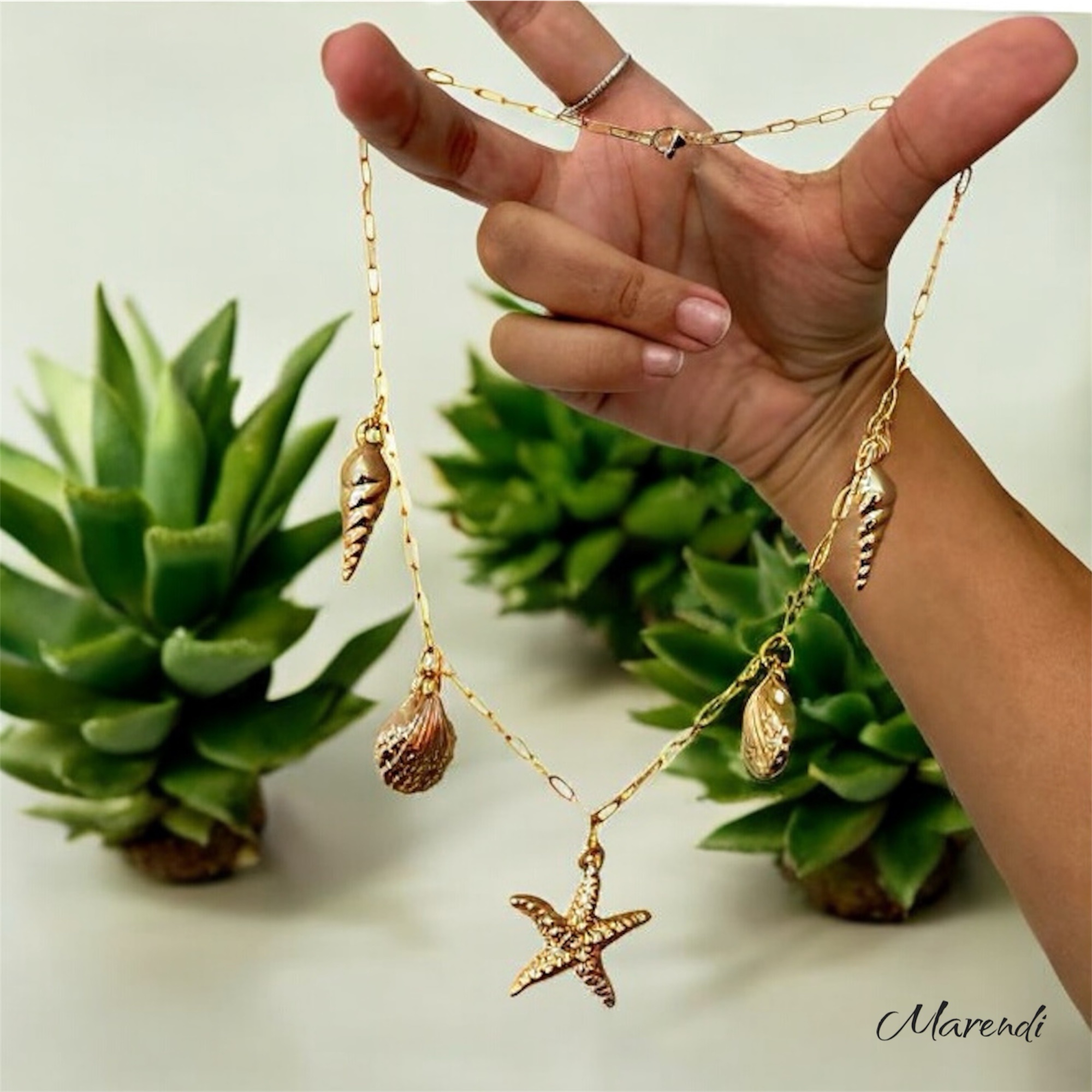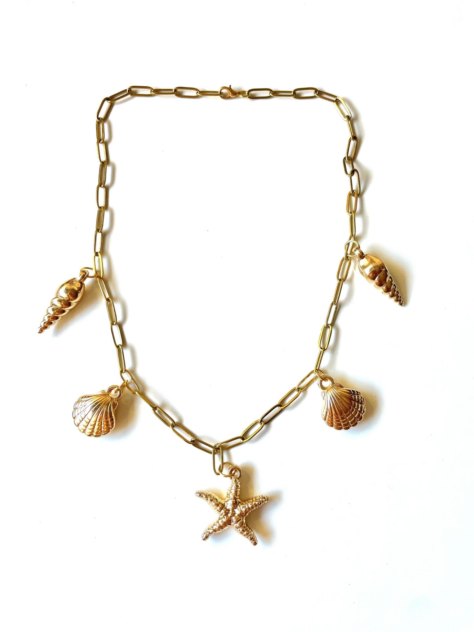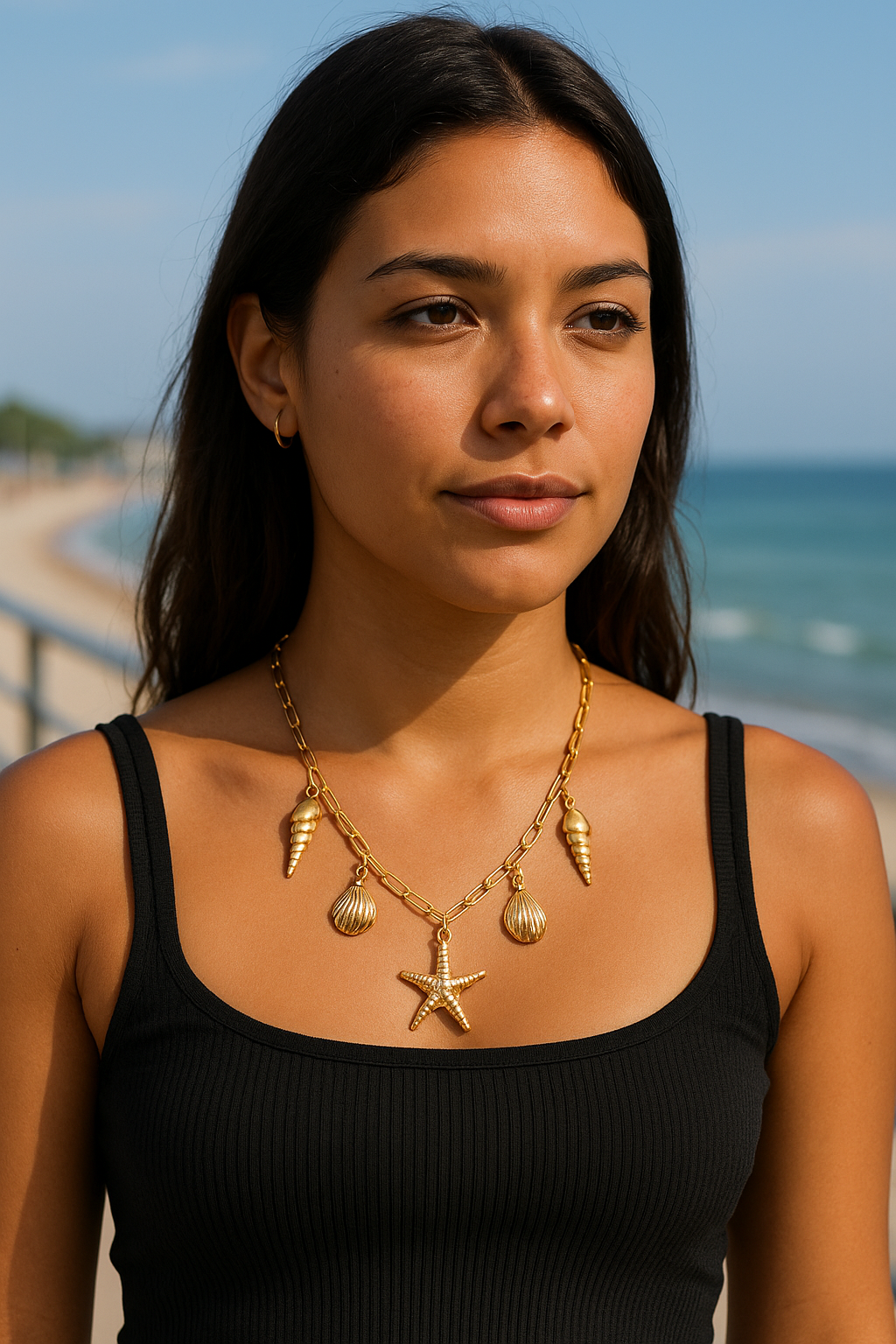 Collar de acero en dorado con charms con motivos de playa. Perfecto para esas noches de verano.
