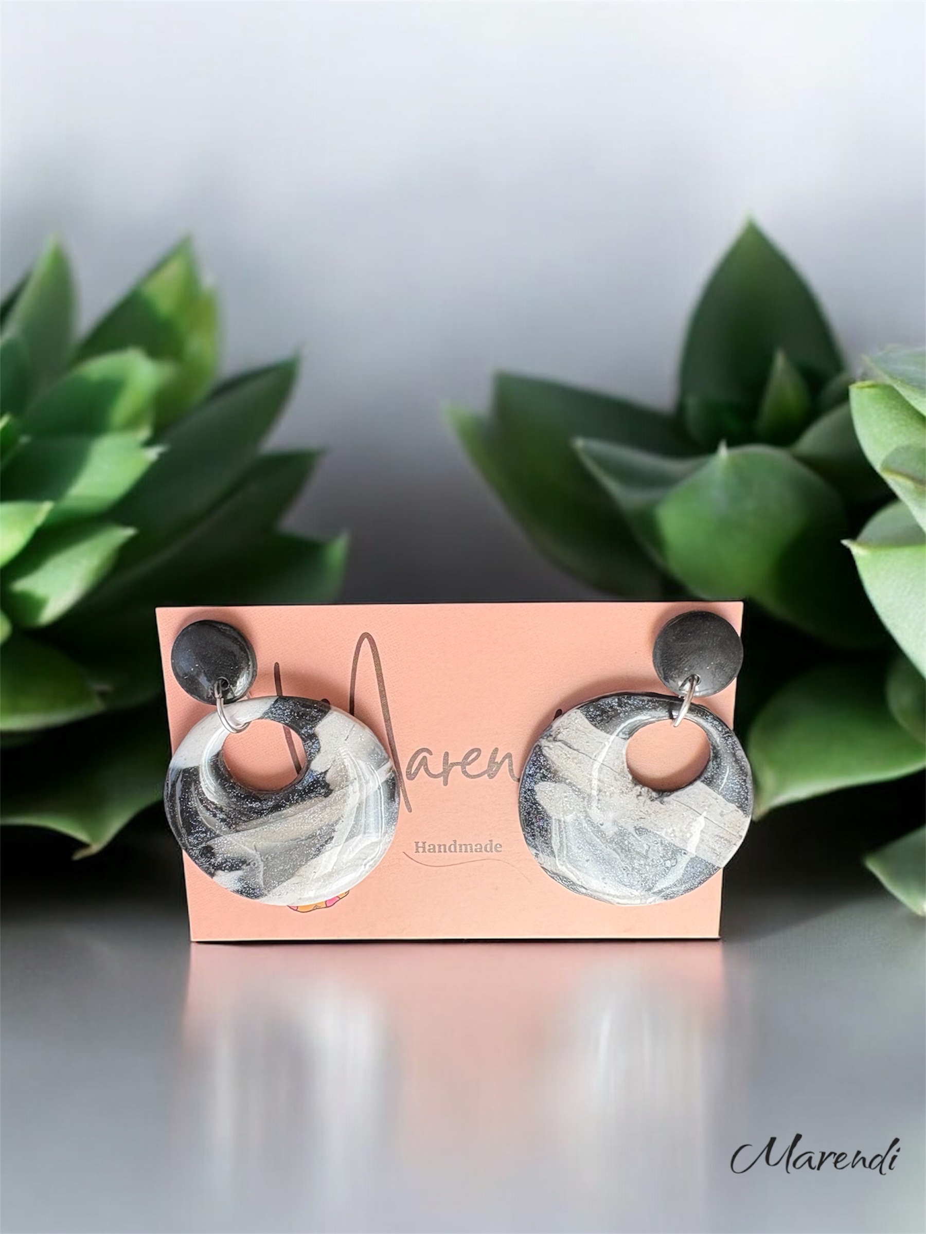 Pendientes con aires de flamenca en el que se combina su forma más tradicional con un estampado marmolado en tono negros y blancos